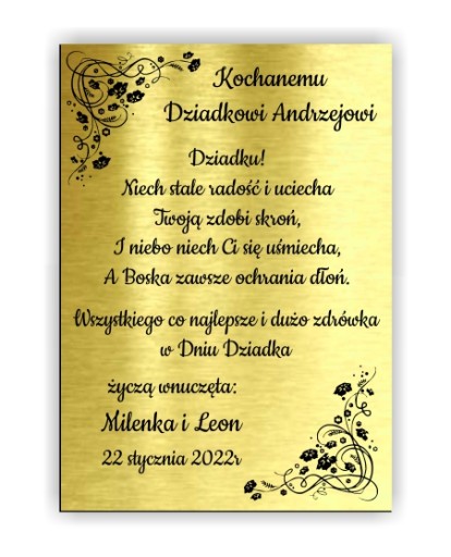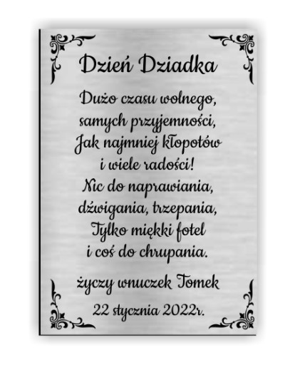 - wykonana techniką grawerowania laserowego z laminatu w kolorze złotym lub srebrnym. Laserowy grawer gwarantuje trwałość i czytelność treści.