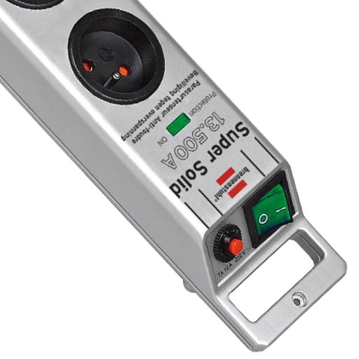 Przedłużacz (anty)przepięciowy Super-Solid firmy Brennenstuhl. Posiada 5 gniazd z dodatkową ochroną przed dotykiem, kabel o długości 2,5m i podświetlany przełącznik dwubiegunowy (włącz/wyłącz).