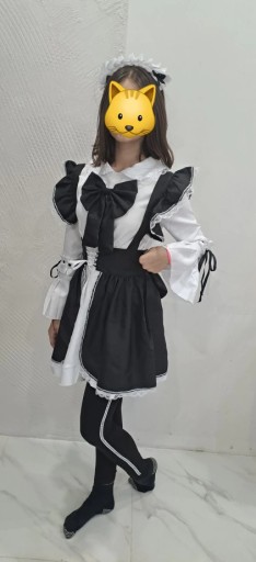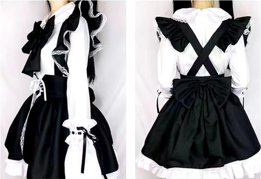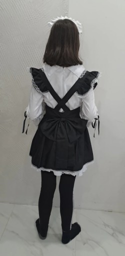 Strój pokojówki inspirowany stylem anime, pełen elegancji i dziewczęcego uroku, idealny dla fanów japońskiej estetyki. Sukienka łączy w sobie czarną spódnicę z białymi koronkowymi wykończeniami, dużą kokardą oraz rękawami ozdobionymi subtelnymi wstążkami. Doskonały na cosplay, sesje zdjęciowe czy tematyczne imprezy, zapewnia niepowtarzalny, stylowy wygląd, który wyróżnia się na tle standardowych kostiumów.