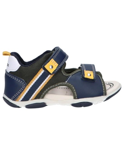 Oddychające sandały chłopięce - idealny na co dzień w ciepłe dni. Geox's Agasim Boy to odporne na światło lekkie sandały wykonane z miękkiej granatowej skóry i jasnoniebieskiej lycry - paleta kolorów, która z łatwością dopasuje się do każdego stroju. Posiada potrójne zapięcie na rzep, co ułatwia zakładanie i regulację. Podeszwa wykonana jest z mocnego lekkiego TR zapewniającego doskonałą przyczepność, a wkładka została pokryta nietoksyczną, pozbawioną chromu, bezpieczną dla dzieci skórą, zapewniającą błogie uczucie dobrego samopoczucia przez cały czas, gdy but leży na stopie. Bieżnik został ulepszony dzięki naszemu Flexy Systemowi dla dodatkowej elastyczności, podczas gdy system Softly Cushioned zapewnia efekt amortyzacji, który pochłania uderzenia i nierówności dochodzące z ziemi, zapewniając przyjemne chodzenie. Dla każdego dziecka jest idealny but. Mamy je wszystkie. Dzięki wysokiej specjalizacji Geox, GEOX wie, jak zapewnić prawidłowy rozwój i dobre samopoczucie młodym stopom na każdym etapie wzrostu.