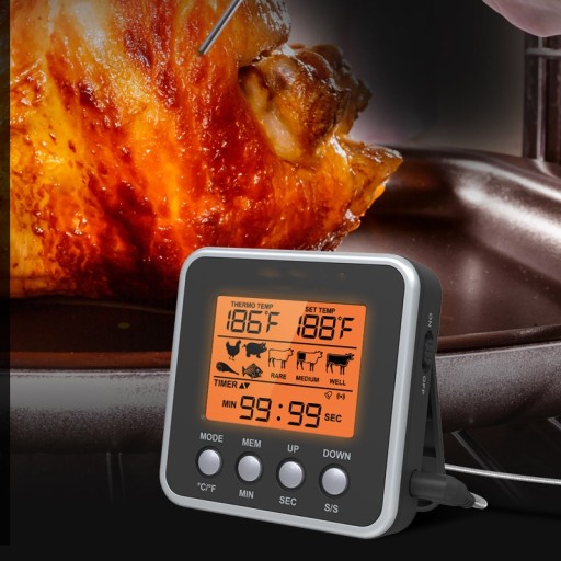 Termometr cyfrowy mięso z grilla do piekarnika termometr z zegarem sonda do mięsa gotowanie termometr kuchenny do mięsa Cechy:Włącz przełącznik, aby zapalić wyświetlacz, aby łatwo dostosować ustawienia lub sprawdzić temps w warunkach słabego oświetlenia. Podświetlenie pozostaje aktywne przez 10 sekund, chyba że nastąpi dalsza operacja.lt;br/gt;Po ulepszonej konstrukcji nowo zmodernizowany silny magnes jest przymocowany do tylnej części termometru cyfrowa kuchenna, która może być stabilnie przymocowana do metalowa powierzchnia.lt;br/gt;Przyciski operacyjne są zaprojektowane z przodu iz boku. Gdy termometr kuchenny jest przymocowany do metalowa powierzchnia do pracy, można bezpośrednio obsługiwać przyciski bez konieczności ponownego wyjmowania.lt;br/gt;Termometr do gotowania zaprogramowany z ustawionymi temperaturami dla 6 rodzajów mięsa z ich różnymi poziomami donencji, wszystkie zaprogramowane temps można zmienić na własny pożądany smak. Gdy jedzenie osiągnie żądaną temperaturę, termometr wyda sygnał dźwiękowy, aby przypomnieć, zachować bezpieczeństwo i gotować z ufnością.lt;br/gt;Funkcje odliczania i odliczania, do 99 minut i 59 sekund.lt;br/gt;Dane techniczne:Materiał: ABS + stal nierdzewnaRozmiar: rozmiary detali na zdjęciuUwaga:Proszę pozwolić 1-2cm błędy ze względu na pomiarze ręcznym.Ze względu na różnicę między różnymi monitorami obraz może nie odzwierciedlać faktycznego koloru przedmiotu.Pakiet zawiera:1 zestaw żywności termometr