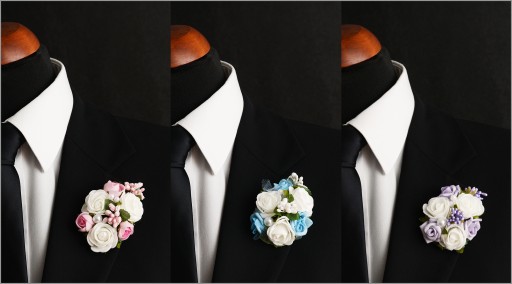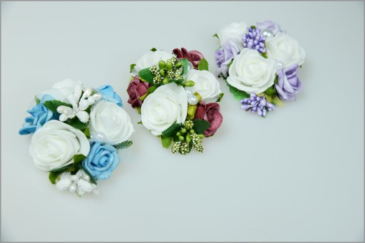Przypinki posiadają wygodne zapięcie w formie agrafki, bukieciki do zawiązania na rękę.