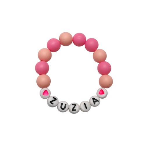 • Koraliki akrylowe z serduszkami po bokach imienia (kolory: niebieski, różowy, czarny, czerwony, zielony, pomarańczowy, złoty)