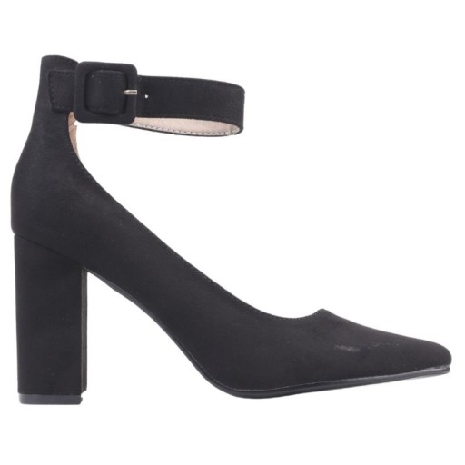 Czółenka damskie na wysokim, powlekanym słupku. Model z zakrytym, szpiczastym noskiem, zabudowaną piętą. Zapinane na pasek z małą sprzączką wokół kostki. Całość zachowana w jednolitej kolorystyce. Wykonane z ekozamszu. Czółenka te pasują do koktajlowych i wieczorowych stylizacji.