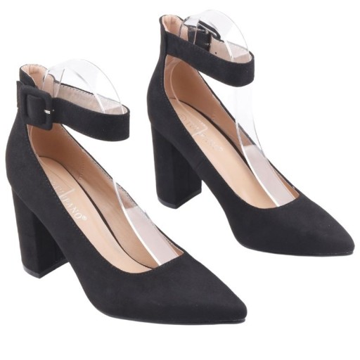 Czółenka damskie na wysokim, powlekanym słupku. Model z zakrytym, szpiczastym noskiem, zabudowaną piętą. Zapinane na pasek z małą sprzączką wokół kostki. Całość zachowana w jednolitej kolorystyce. Wykonane z ekozamszu. Czółenka te pasują do koktajlowych i wieczorowych stylizacji.