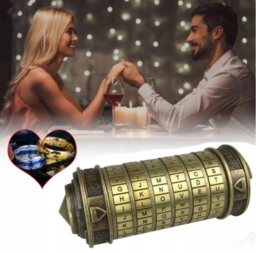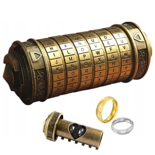 Da Vinci Code Cryptex to najzabawniejszy prezent dla przyjaciela. Otwiera się z ustawionym hasłem, które możesz zmienić w dowolnym momencie. Przechowuj swoje notatki, wiersze, biżuterię, klucze lub inne kosztowności. Zastosowania tego Cryptexu są ograniczone tylko przez twoją wyobraźnię, idealne do wysłania komuś najbardziej wyjątkowego prezentu w historii. Jestem pewien, że spodoba się twoim znajomym. Początkowe hasło to ILOVEU. Następnie otwierasz go, a w środku znajdują się dwa pierścienie.