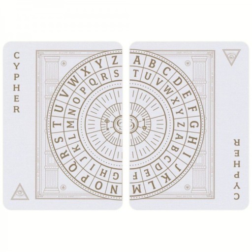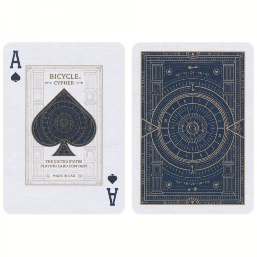 Bicycle Cypher jest inspirowana tajemniczymi symbolami i kryptografią używaną przez historyczne tajne stowarzyszenia. Rewersy i awersy kart zawierają zaszyfrowaną wiadomość, którą kolekcjonerzy mogą rozszyfrować. Klucz do tłumaczenia znajduje się na kartach reklamowych wewnątrz talii. Ta luksusowa talia zawiera wyrafinowaną, ciemnoniebieską zakładkę, a wewnętrzna strona zakładki jest zadrukowana eleganckim wzorem klucza. Skomplikowana linia na zewnętrznej stronie zakładki jest wytłoczona na gorąco złotą folią i zaakcentowana tłoczeniem.