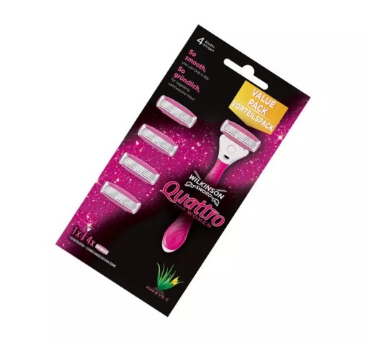 Maszynka do Golenia Wilkinson Quattro Sword dla kobiet posiada 4 ostrza do golenia, które zapewnią delikatne golenie oraz gładka skórę. Posiada również metalową, dobrze wyprofilowaną rączkę oraz ruchomą główkę, dzięki czemu golenie staje się łatwe i komfortowe. Paski są wzbogacone kompleksem Aloe & Vit. E.