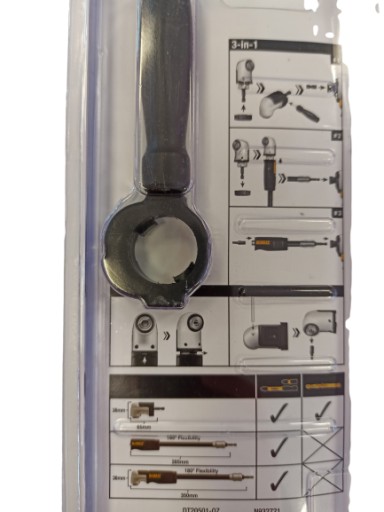 - elastyczna przedłużka udarowa 180o składa się z 3 elementów (przedłużki elastycznej, głowicy kątowej i rękojeści) umożliwiających złożenie w 3 różnych konfiguracjach o długościach: 65mm, 285mm, 350mm
