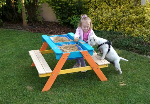 ✔️ Pod blatem stołu znajdują się dwa niebieskie plastikowe pojemniki, które można wypełnić piaskiem lub wodą, można tam trzymać również zabawki.