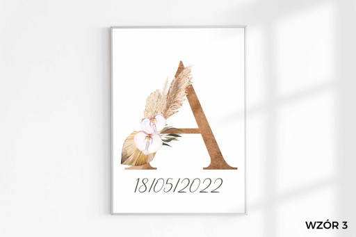 Plakat z literą występuje w trzech wersjach. Możemy wybrać opcję z samą literą lub dodatkowo uzupełnić plakat o pełne imię dziecka lub datę urodzin. W wiadomości po zakupie podać wybraną literę oraz odpowiednio: wzór nr 1 ( sama litera), wzór nr 2 (+ imię), wzór numer 3 (+data)