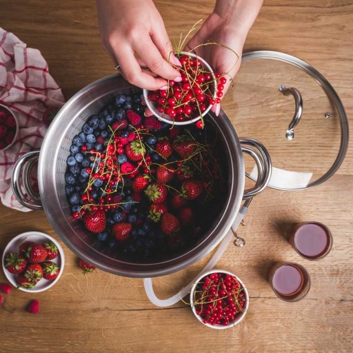 Praktyczny zestaw do przygotowywania soków i dżemów, wykonany ze stali nierdzewnej 18/0. Wykończenie garnka na zewnątrz polerowane, wewnątrz - satynowe, wielowarstwowe dno, ścianki grubości 0,5 mm.