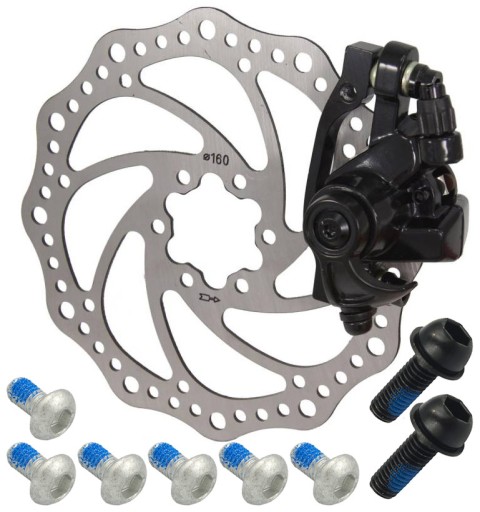Kompletny hamulec tarczowy mechaniczny przedni - zestaw: tarcza, zacisk, klocki, śruby