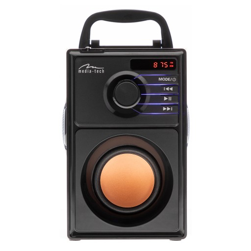 - Z prawej i lewej strony MT3145 znajdują się dwa głośniki średniotonowe. Na panelu przednim znajduje się wyświetlacz informacyjny LED, przyciski sterujące oraz membrana 3-calowego głośnika niskotonowego. Z boku obudowy znajduje się port USB, wejście AUX i slot na karty pamięci microSD oraz gniazdo USB-C służące do ładowania.