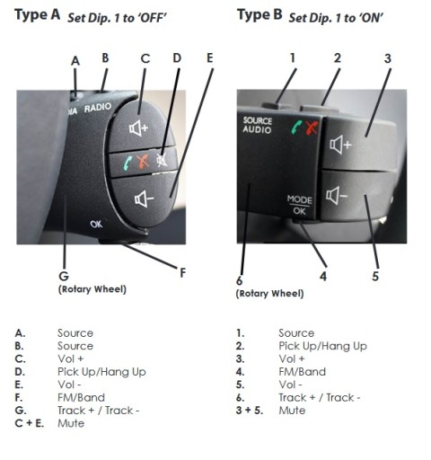 Funkcje sterowania kierownicą można regulować, zmieniając położenie przełącznika DIP 1 w skrzynce interfejsu. Otwórz plastikową obudowę i ustaw przełącznik DIP zgodnie z własnymi preferencjami przed instalacją. Zobacz poniżej, aby uzyskać informacje: