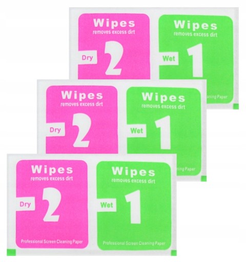 - 3x Ściereczka nr. 1 - mokra, nasączona alkoholem do odtłuszczenia powierzchni ekranu