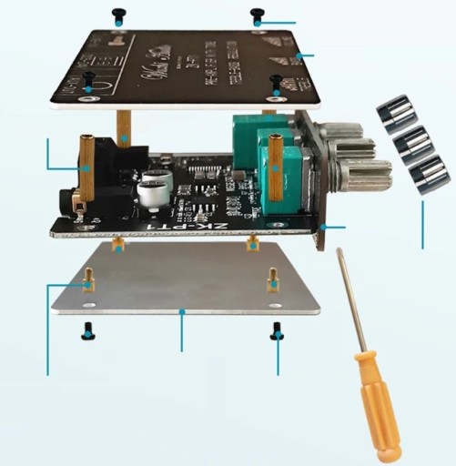 Wzmacniacz wymaga złożenia, tzn. skręcenia śrub i założenia gałek.
