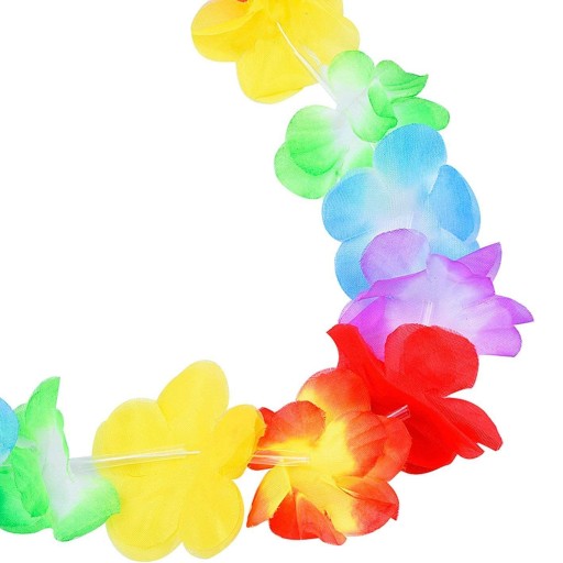 Piękny hawajski naszyjnik wykonany z kolorowych kwiatków z tkanin w kolorach tęczy.