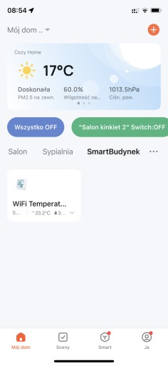- Aplikacja działa w języku polskim, można w niej dodać i sterować różnymi inteligentnymi urządzeniami