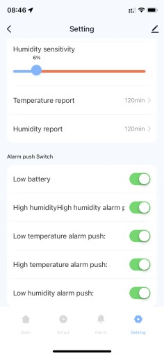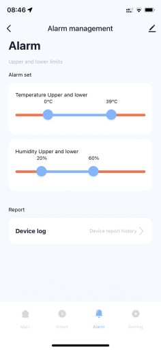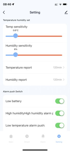 - Ustawienia powiadomień przy przekroczeniu temperatur oraz niskim stanie baterii.