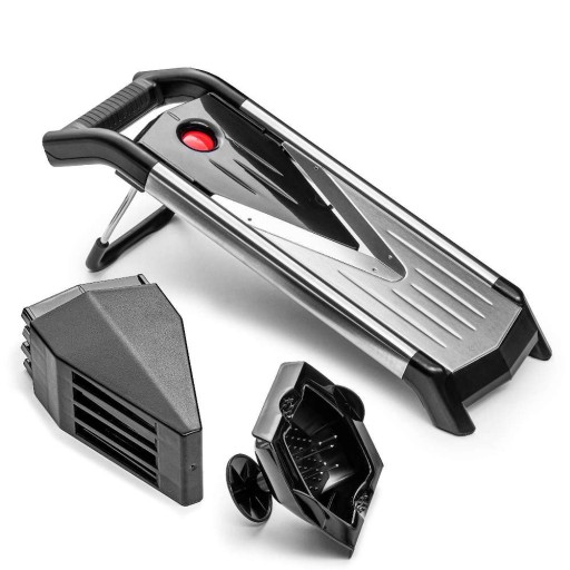 Ręczna szatkownica mandolina Forgast z 5 ostrzami - do pomocniczego i fantazyjnego szatkowania warzyw. Element dociskowy dla bezpieczeństwa krojenia. Bezpieczna antypoślizgowa podstawa.