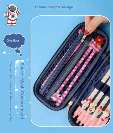 - Lewa część posiada siateczkową komorę, prawa miejsce na rząd kredek i 4 pojedyncze otwory na gumkę na np. mazaki