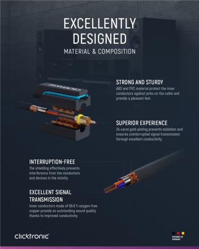 Jeśli zależy Ci na świetnym brzmieniu, potrzebujesz odpowiedniego kabla audio. Oddziaływania elektromagnetyczne mogą szybko zakłócać delikatne sygnały audio, dlatego w oferowanym kablu zastosowano wielowarstwowe ekranowanie, które chroni delikatne sygnały przesyłane do wzmacniacza przed zniekształceniem. Czyste materiały i precyzyjne wykonanie również się do tego przyczyniają.