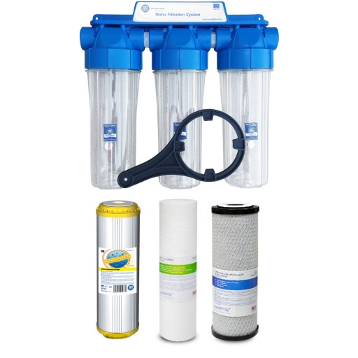 Filtry wykonane są z wytrzymałego tworzywa (wytrzymują ciśnienie do 7 bar). Cały zestaw składa się z trzech połączonych 10-calowych korpusów zamocowanych na jednym bardzo solidnym uchwycie montażowym. Jego trzyczęściowa obudowa umożliwia bardzo szybką wymianę wkładów - wystarczy odkręcić pierścień pod głowicą, by zdjąć korpus. Dzięki przezroczystej konstrukcji szybko można ocenić stan wkładów.