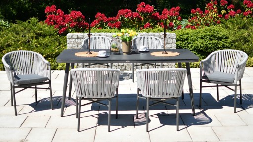 Szukasz pomysłu na nowoczesną aranżację tarasu?Chciałbyś oczarować swoich gości podążając za nowoczesnymi trendami na strefę relaksu w swoim ogrodzie?Przedstawiamy zestaw CALLAS 6/180 w kolorze jasnoszarym. Oryginalny zestaw ogrodowy dla 6 osób, charakteryzujący się efektownym designem i jakością wykonania. Mebel wygląda pięknie zarówno z szarymi kafelkami, jak i drewnianym blatem. Zestaw CALLAS 6/180 składa się z 6 wygodnych krzeseł z nylonowymi linkami oraz wygodnych i sprężystych poduszek na siedziska, które podnoszą komfort wypoczynku. Stół o długości do 180 cm pokryty szkłem z efektem kamienia jest bardzo praktyczny, oryginalny i łatwy w utrzymaniu. Całość wsparta jest na lekkiej, odpornej na korozję konstrukcji aluminiowej, która zapewnia zestawowi odpowiednią stabilność i trwałość, pozytywnie wpływając na jego efekt wizualny. Materiały użyte do produkcji mebli są najwyższej jakości i odporne na niekorzystne warunki atmosferyczne, takie jak deszcz, niskie temperatury i promienie UV. Dzięki temu elementy można bezpiecznie pozostawić na zewnątrz. Powierzchnia nie odkształca się i długo zachowuje swój pierwotny wygląd, piękny kolor i właściwości. Zamów zestaw mebli ogrodowych do jadalni CALLAS 6/180 i ciesz się stylowym i nowoczesnym ogrodem. Neutralne odcienie mebli w połączeniu z oryginalnym designem doskonale współgrają z nowoczesnymi trendami wnętrzarskimi.