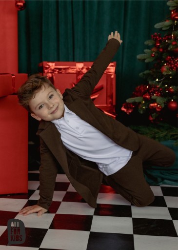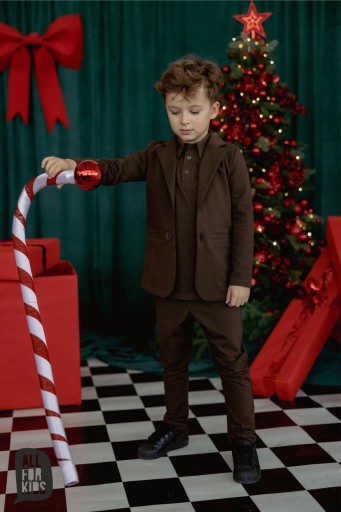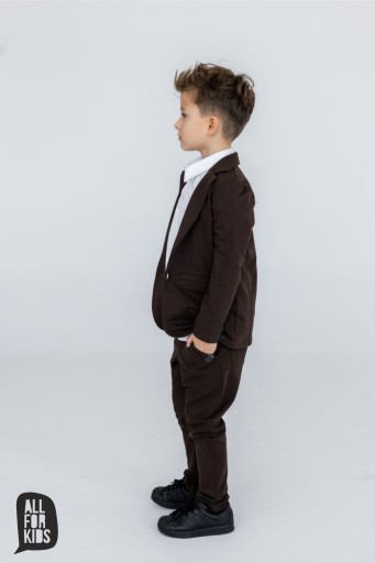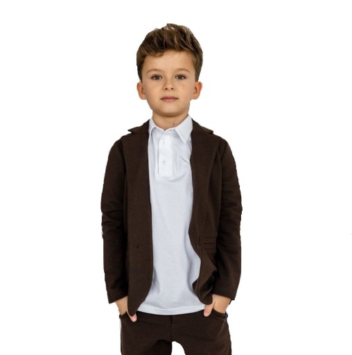 Bawełniana marynarka chłopięca. Wygodny fason z eleganckim akcentem. Ubranie w kolorze brązowym. Z przodu imitacja dwóch kieszonek, zapiana na jeden guzik. Długi rękaw.