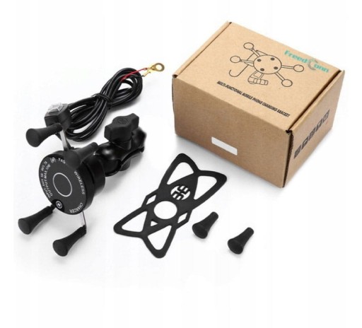 - Uchwyt FreedConn MC7W z ładowaniem indukcyjnym z 4 ramionami zakończonymi gumowymi gripami, ładowarką USB, włącznikiem i kablem
