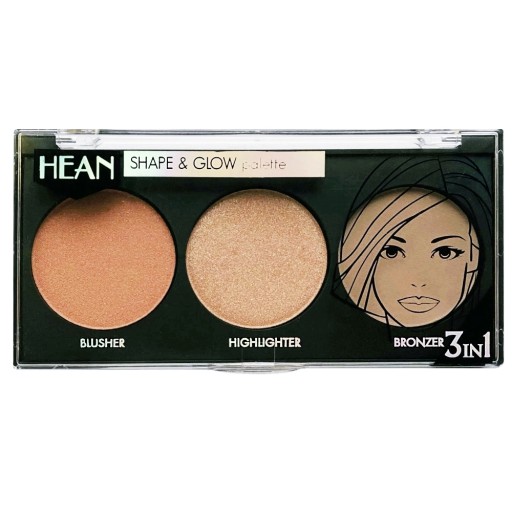 SHAPE & GLOW Palette marki HEAN. Paleta do modelowania. W szybki i prosty sposób umożliwi wykonanie perfekcyjnego konturowania kształtu twarzy, podkreślenia jej rysów, a także wykonturowanie i uwypuklenie wybranych partii. Paletka składa się z specjalnie opracowanego różu holograficznego, który podkreśla i uwydatnia kości policzkowe, mocno napigmentowanego rozświetlacza, który nadaje twarzy blasku i zdrowego wyglądu oraz matowego bronzera, który wysmukla oraz modeluje rysy twarzy. Dodatkowo wszystkie 3 produkty bez problemu mogą posłużyć jako cień do powiek. Całość została umieszczona w specjalnej, kompaktowej paletce, wykonanej z moznego plastiku.