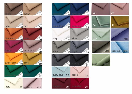 - kolor okładki - do wyboru około 37 kolorów tkaniny welurowe
