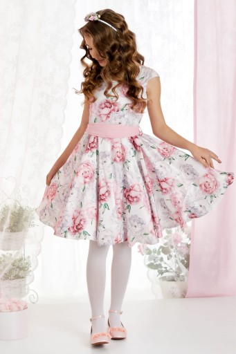 Sukienka z wysokogatunkowej satyny drukowanej w różowo białe kwiaty na jasnym tle.