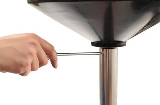 Zlewarka posiada szeroką miskę spustową o średnicy 420 mm zakończoną kratką zabezpieczającą, która ułatwia zlewanie oleju, a także 20l zbiornik, który dodatkowo wyposażony jest w kółka skrętne ułatwiające przemieszczanie zlewarki w miejscu pracy.
