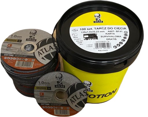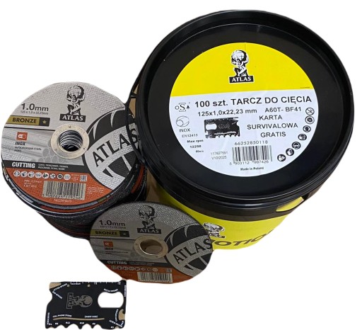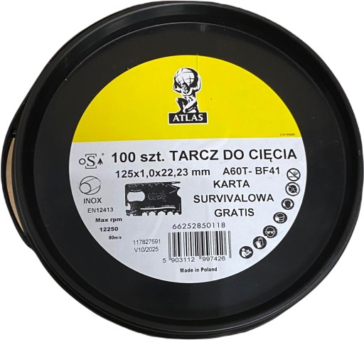 ATLAS 100 szt. Tarcz do cięcia 125x1 + karta survivalowa w wiaderku