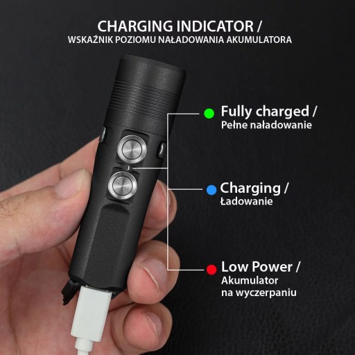 - 2) Kiedy napięcie w baterii spada poniżej 2,8 V, nie jest możliwe ponowne uruchomienie latarki, dopóki nie zostanie podpięta do ładowania.
