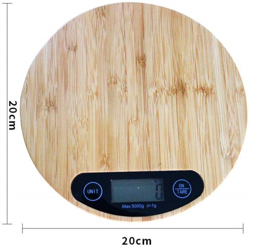 Okrągła waga kuchenna bambusowa elektroniczna z wyświetlaczem LCD do 5kg z funkcją tary.