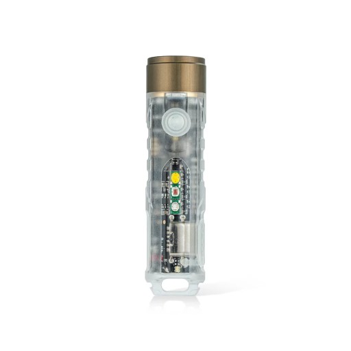 Akumulator i USB-C. Latarka posiada wydajny akumulator o pojemności maksymalnej 330 mAh, co daje 72 h czasu pracy w najniższym trybie (Monlight). Ładowanie następuje po przez port USB-C. Latarka posiada wskaźnik procesu ładowania, oznajmiający pulsującym kolorem niebieskim trwanie procesu ładowania, a ciągłym kolorem zielonym, pełne naładowanie akumulatora. Kiedy akumulator jest na skraju wyczerpania wskaźnik zasygnalizuje rozładowanie świecąc się na kolor czerwony.