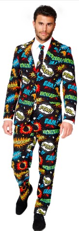 Ten kostium Mr. Comics dla mężczyzn pochodzi z marki Opposuit. Składa się z marynarki, spodni i krawata (bez koszuli i butów). Całość wykonana z dobrej jakości czarnej tkaniny, z kolorowymi nadrukami. Nadruki przedstawiają komunikaty takie jak „Badaboom”, „Bam!” lub „Pow!” w kolorowych komiksach w stylu listu. Kurtka zapinana z przodu na 2 guziki. Krawat wiązany na szyi. Spodnie zapinane na zamek błyskawiczny. Posiada kieszenie z przodu iz tyłu.
