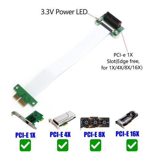 1. Kabel obsługuje szybkie karty PCI-E 1X, 4X, 8X i 16X, ale działa tylko z prędkością 1X.