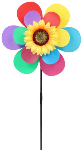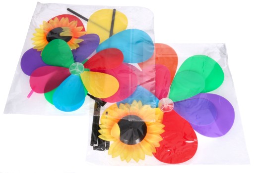 Wiatrak wykonany z plastikowego tworzywa pcv a stelaż z plastiku, kwiatek z materiałowymi listkami.