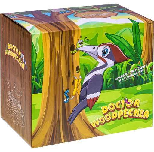 Kolorowe robaczki oraz ptaszek posiadają na końcach magnesy, dzięki czemu można je przenosić ćwicząc przy tym zręczność. Żywe kolory zabawki zręcznościowej przyciągną uwagę dziecka oraz zachęcą do zabawy. Zadaniem dziecka jest nakarmienie głodnego pisklaka robaczkami i uratowanie drzewa od szkodników. Żółty dzięcioł ma w dziobie magnesik, dzięki któremu przyciąga robaki za główkę. Następnie robak powinien trafić do dzioba pisklaka. Jeśli dziecku uda się przełożyć wszystkie robaczki to wygrywa! Pisklak nakarmiony i drzewo wyleczone!