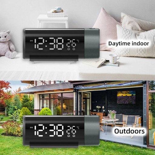 BUDZIK Z PROJEKTOREM Z REGULACJĄ 180° — Projektor obracany o 180 stopni wyświetla wyraźny i nieuciążliwy czas i temperaturę na ścianie lub suficie, dzięki czemu czas i temperaturę można wyraźnie zobaczyć nawet podczas leżenia w łóżku.