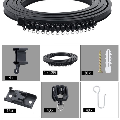 W zestawie: Nasza prowadnica do zasłon jest dostarczana ze wszystkim, czego potrzebujesz, aby rozwiązać Twój problem z przestrzenią! Pakiet zawiera 1 x 5-metrowa elastyczna prowadnica do zasłon, 40 x rolka gąsienicowa, 40 x żelazny haczyk do zasłon, 15 x zatrzaskowy wspornik sufitowy, 4 x osłona na końce ,15 x śruby mocujące