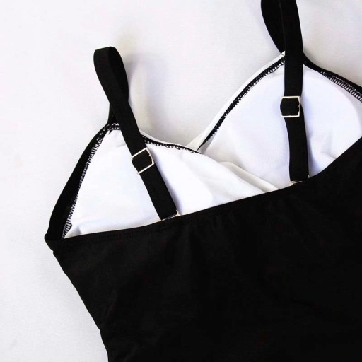 Kostium posiada białe wstawki, aby optycznie wymodelować sylwetkę.