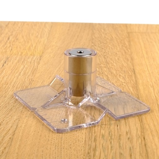 Przeźroczysta podstawa ułatwia precyzyjne ustawienie przyrządu we właściwym miejscu. Szpilki pozycjonujące pozwalają na szybkie wyznaczenie środka w elemencie na przykład na potrzeby wywiercenia otworów na kołek.