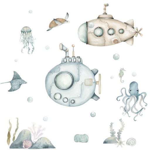 ⭐ ZESTAW DRUKOWANYCH NAKLEJEK NA ŚCIANĘ WYCINANY Z FOLII MATOWEJ Z MOTYWEM ŁODZI PODWODNYCH ⭐