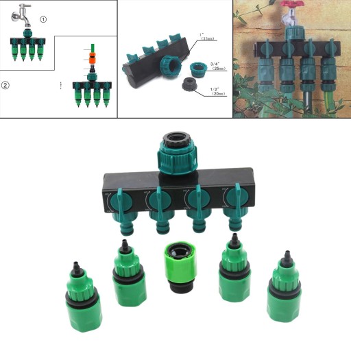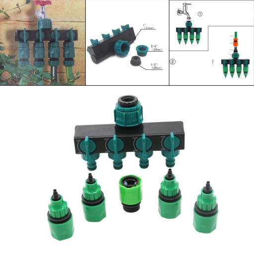 : Rozdzielacz węży ogrodowych posiada 4 złączki i 4 zawory 4-drożny rozdzielacz węża ogrodowego, który może przekształcić 1 w 4 źródła o wysokim przepływie Złącza w każdy sposób mogą regulować lub odcinać przepływ , w zależności od potrzeb Obracanie złącza wtedy, rozdzielacz węża łączy się z króćcem Żadne narzędzie nie jest potrzebne Nadaje się do nawadniania ogrodu, nawadniania krajobrazu, nawadniania kroplowego, wzrostu sadzonek dalej