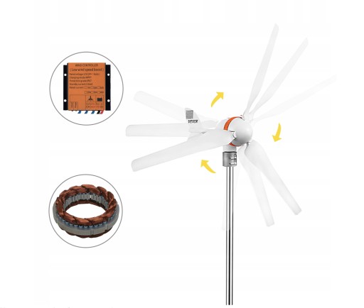 Ta turbina wiatrowa składa się z wysokiej jakości aluminiowego korpusu, ogona ze stali nierdzewnej i ostrza z nylonu. Turbina wykorzystuje 3-fazowy silnik magnetyczny, zewnętrzny kontroler MPPT i zainstalowaną obręcz, aby zapewnić wysoką wydajność energetyczną i bezproblemową instalację. Ponadto turbina charakteryzuje się niską prędkością początkową, wysokim wykorzystaniem energii wiatru, niskimi wibracjami i pięknym wyglądem, nadającą się do użytku na morzu, łodzi, podwórku i innych zastosowaniach domowych.